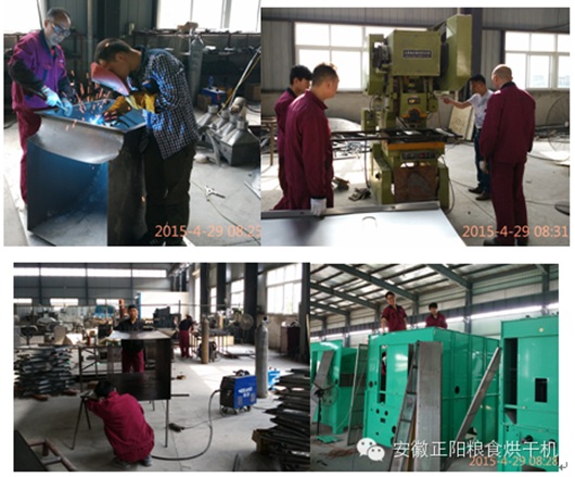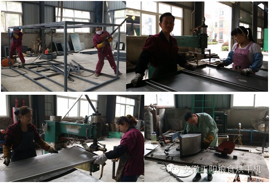 工人們正在車間內(nèi)加緊生產(chǎn)糧食烘干機(jī),現(xiàn)場(chǎng)機(jī)器轟鳴,焊花飛濺。